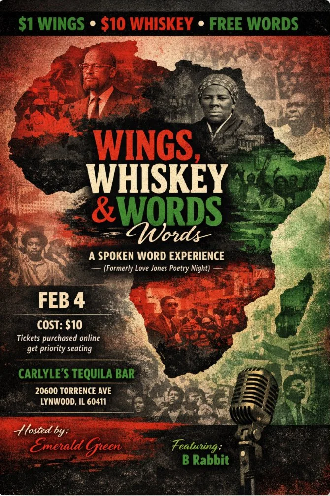 Upcoming events. Feb 4 Wings Whiskey and Words Wednesday, February 4, 2026 7:30 PM 9:30 PM Google Calendar ICS CLICK PHOTO FOR TICKETS View Event → Jan 7 A Spoken Word Experience Wednesday, January 7, 2026 7:00 PM 11:00 PM Carlyle’s Tequila Bar (map) Google Calendar ICS Come share your art or just be an ear. It’s a vibe View Event → Dec 10 Love Jones Wednesday, December 10, 2025 7:00 PM 11:00 PM Carlyle’s Tequila Bar (map) Google Calendar ICS It’s a Vibe View Event →